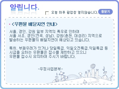우체국 택배업무가 폭우로 인하여 지연될 수 있다고 합니다.